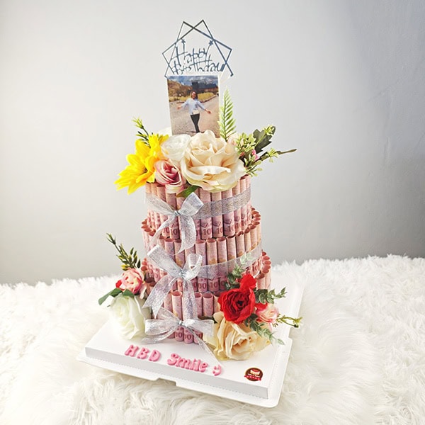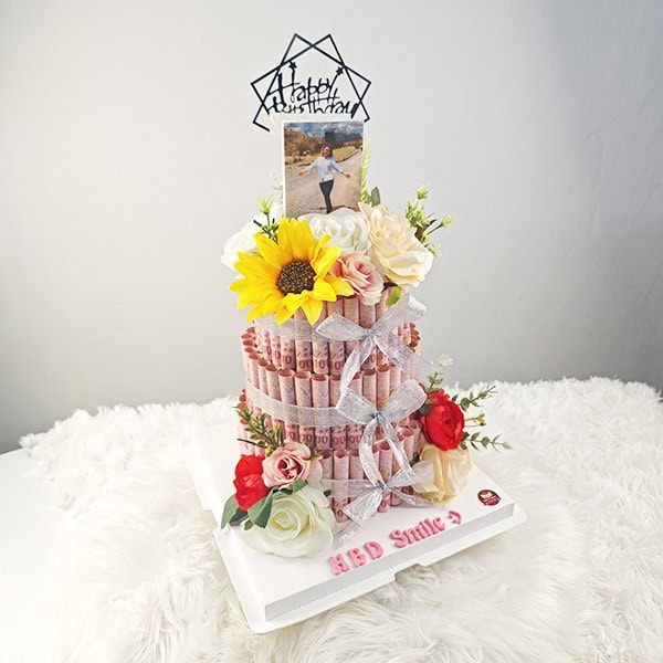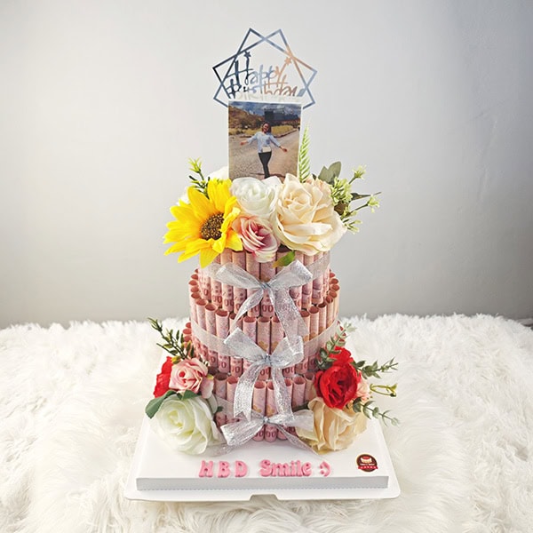 เค้กม้วนเงิน ตกแต่งดอกไม้สด สกรีนรูปภาพPop-up