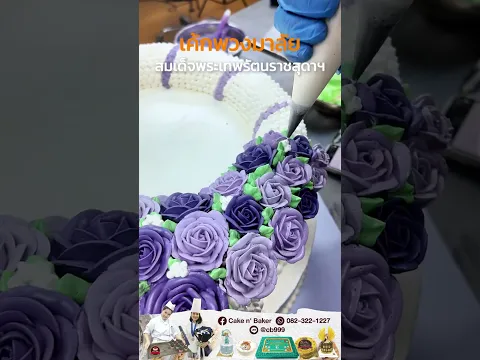 2. พวงมาลัย: บีบครีมดอกกุหลาบสีม่วงหลากเฉดที่บีบขึ้นรูปทีละดอกๆ อย่างประณีต